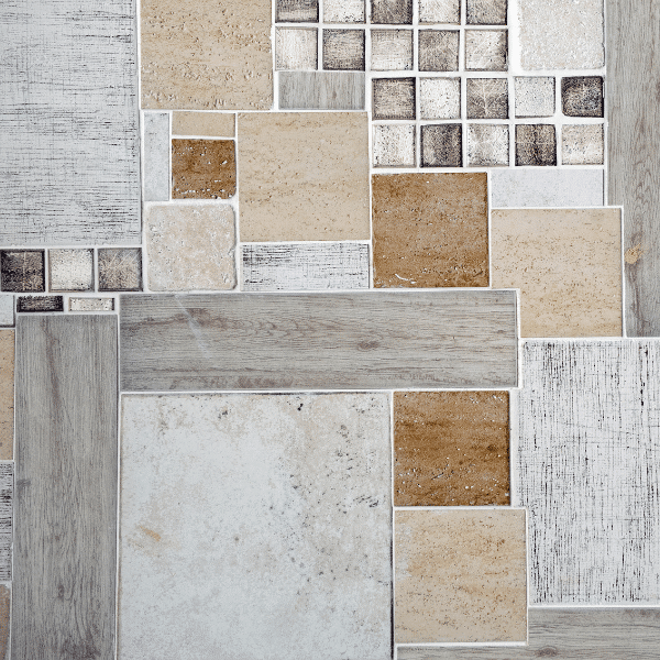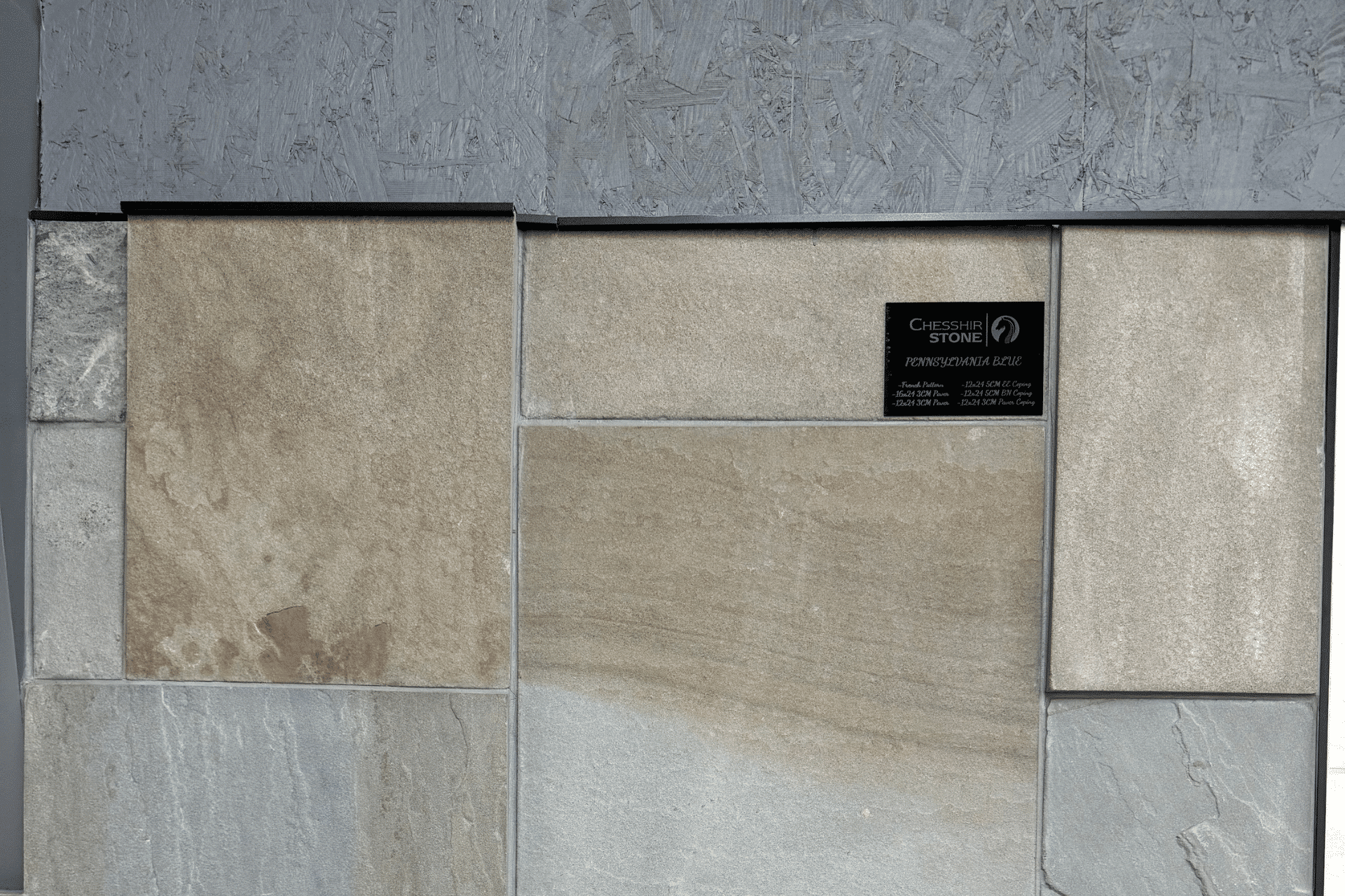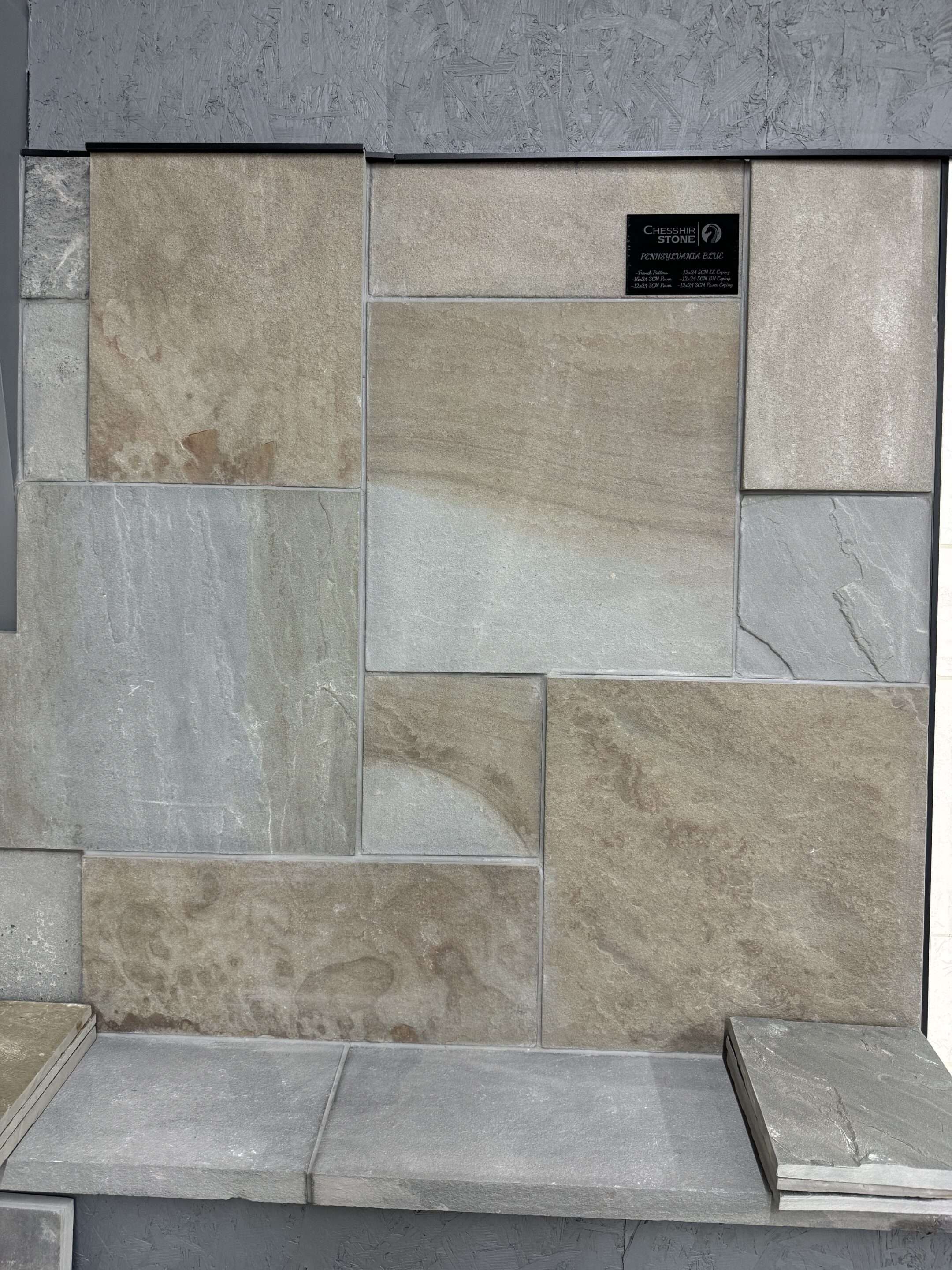 Pennsylvania Blue is high-quality bluestone quarried in Pennsylvania and New York, known for full color range—blue, gray, and natural earth tones. French pattern layout mixes multiple tile sizes for a custom, high-end look. Often 3cm thickness. Harder and lasts longer than sandstone or limestone outdoors.