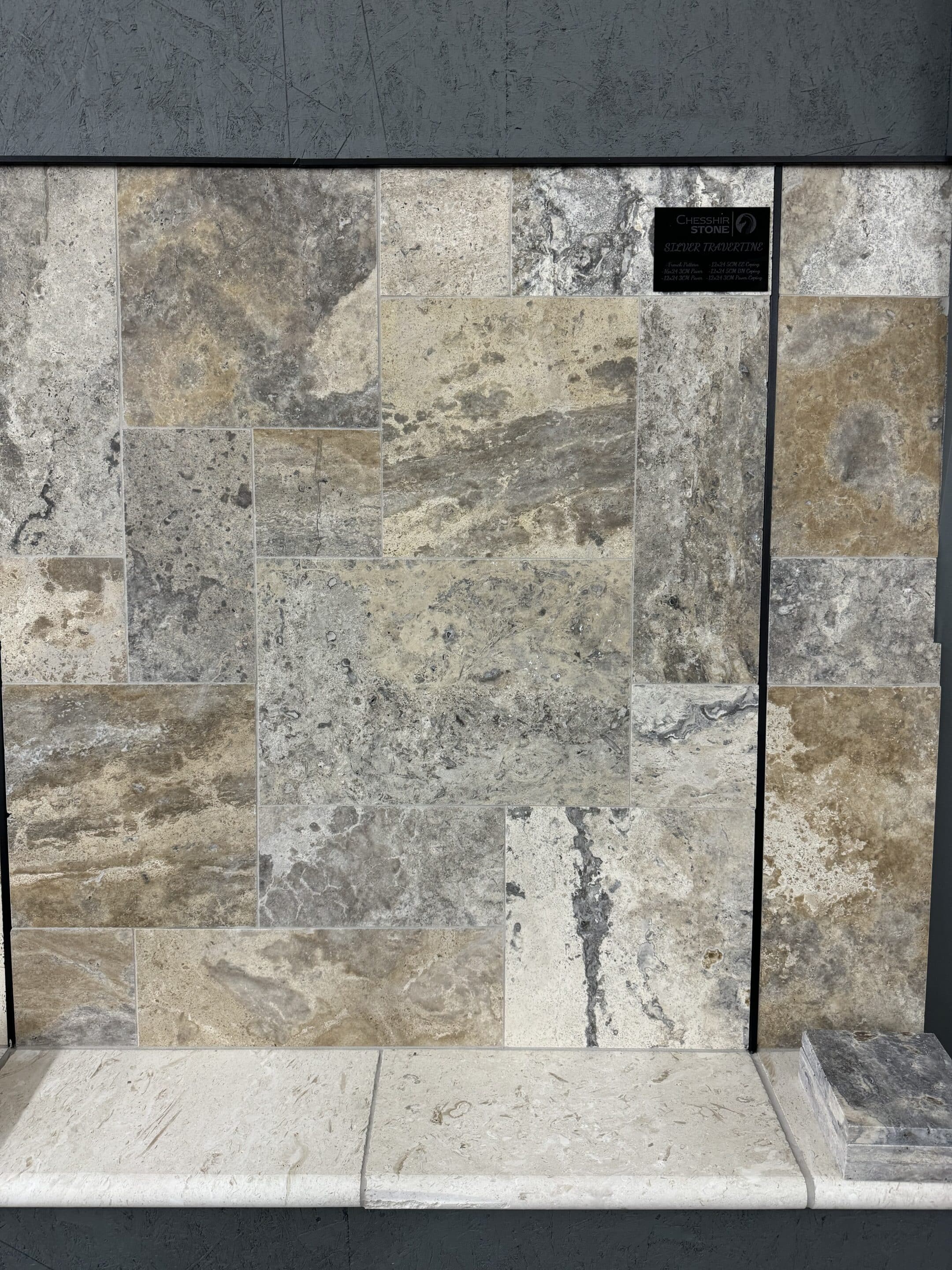 Silver travertine is natural stone with a mixture of light and dark silver, gray, ivory, and beige tones. French pattern uses four tile sizes in a repeating layout for a classic look. Key features: tumbled finish for texture and grip, 3cm thickness for outdoor use.
