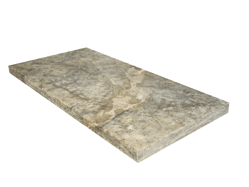 Silver coping adds silver tone and natural stone edge for pool and patio. Chesshir Stone & Rock Supply.